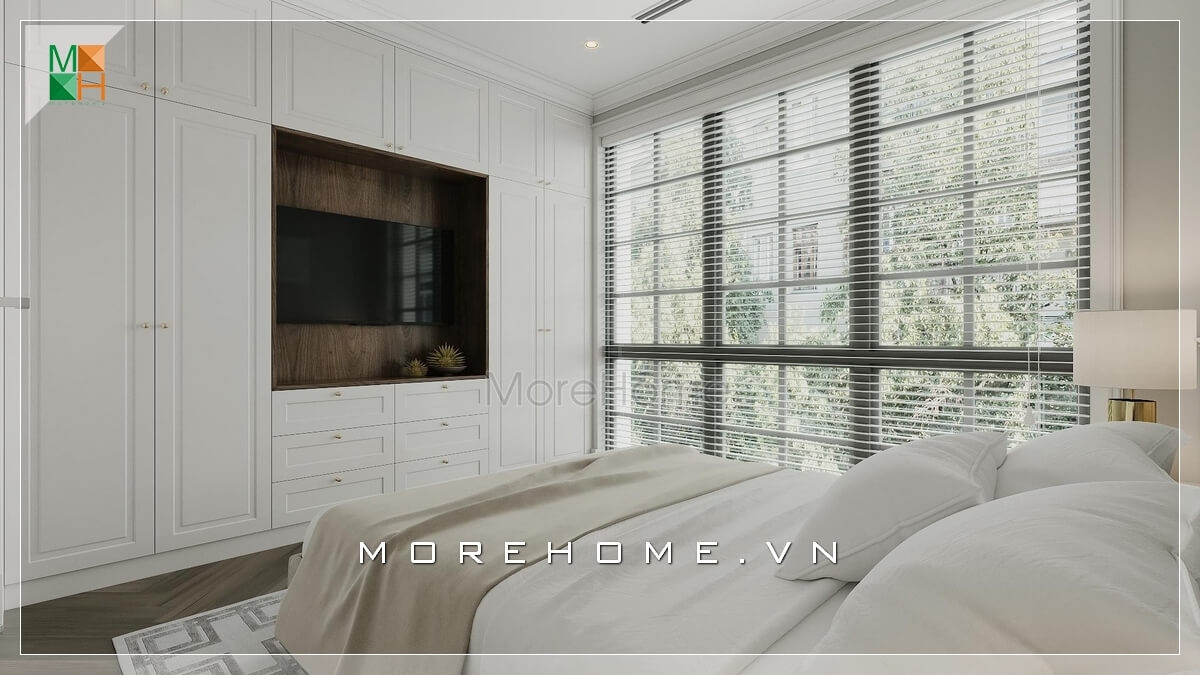 Phòng ngủ hiện đại trong thiết kế nhà phố gây ấn tượng với tone trắng trẻ trung và hệ thống tủ âm tường tiện lợi.
