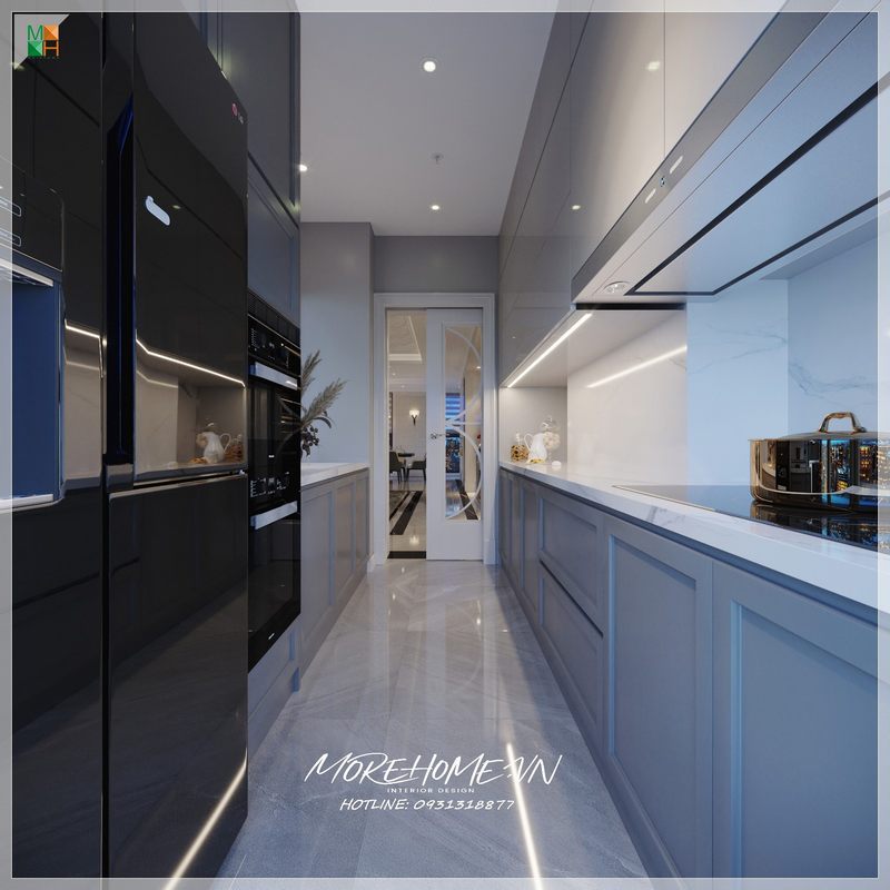 Thông thường bạn sẽ thấy khu vực bàn đảo sẽ nằm trong phòng bếp để có thể đáp ứng kịp thời nhu cầu ngay trong phòng bếp, điều này đòi hỏi phòng bếp phải khá rộng, nhưng nếu hẹp về bề ngang bạn vẫn có thể sở hữu không gian bếp đảo tuyệt đẹp như trong ý tưởng trang trí nội thất tại biệt thự Parkcity bởi Nội thất Morehome.
