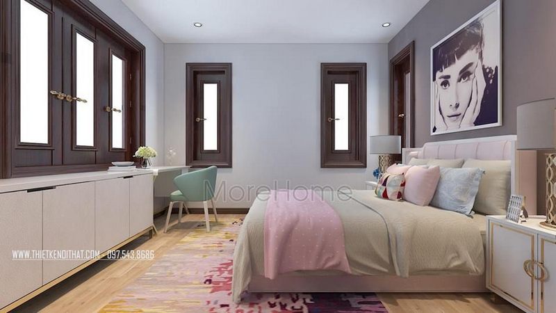 Sự kết hợp hài hòa giữa giường ngủ tân cổ điển bọc da khung gỗ, bàn làm việc đến tủ quần áo chung cư sử dùng chung chất liệu gỗ và màu sắc đông nhất giúp căn phòng ngủ trở nên sang trọng nhưng ấm cúng.