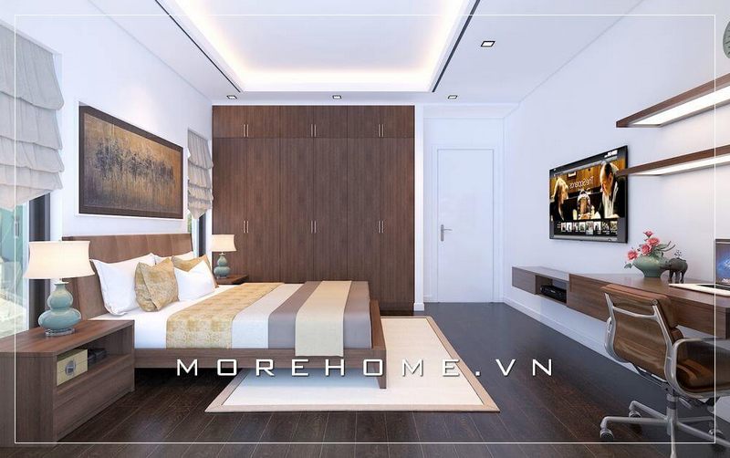 Một căn phòng ngủ không thể không có một cái tủ, kệ để đồ. Với thiết kế tủ, kệ gỗ hiện đại âm tường giúp căn phòng ngủ trở nên rộng rãi, thông thoáng và tiện nghi hơn.