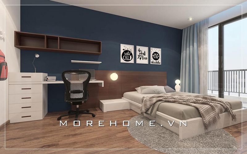 Sắp xếp nội thất phòng ngủ với ý tưởng tập trung vào công năng từ góc làm việc, học tập và giảm thiểu tối đa chi tiết không hữu hiệu như tivi và thay vào đó là tranh treo tường canvas nghệ thuật đẹp mắt.
