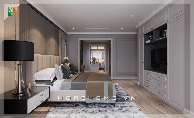 Bố trí nội thất phòng ngủ 20 m2 đầy sang trọng và tiện nghi, tủ quần áo được thiết kế âm tường giúp tiết kiệm một khoản diện tích tối đa cho căn phòng
