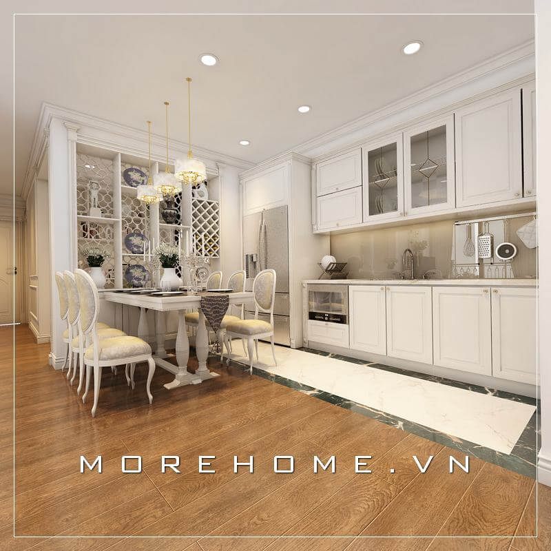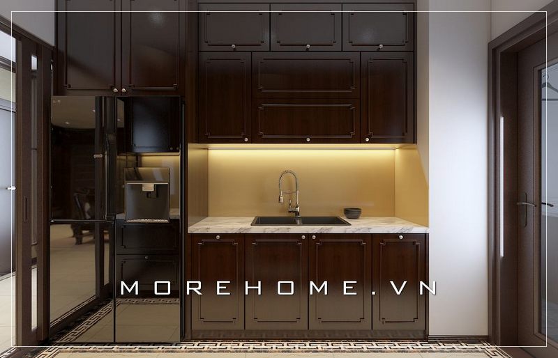 Chỉ với 1 hàng đường thẳng duy nhất, các kiến trúc sư MoreHome thiết kế hệ thống tủ bếp tiện nghi từ gỗ tự nhiên kiểu tân cổ điển đã giúp căn bếp tiện nghi hơn