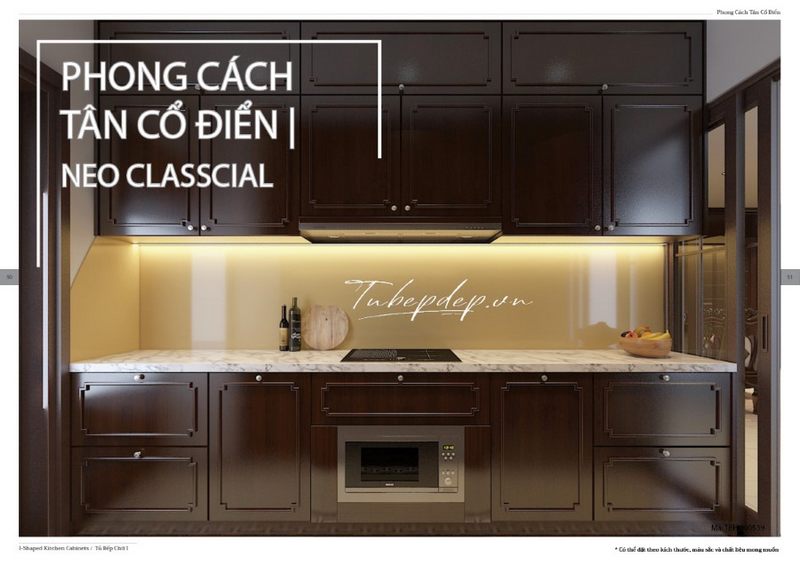Tủ bếp phong cách tân cổ điển lạ mắt với những đường cong hay những họa tiết chạm trổ tinh tế tạo nên không gian nấu nướng sang trọng đồng thời thể hiện được gu thẩm mỹ của gia chủ