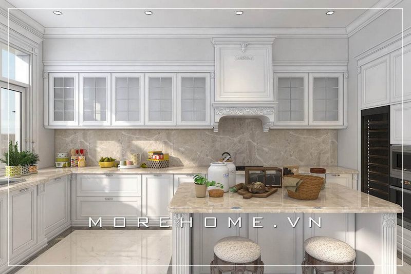 Mẫu tủ bếp gỗ màu trắng, đường nét chạm khắc tân cổ điển tinh tế và ấn tượng mang đến không gian nấu nướng sang trọng và tiện nghi cho người nội trợ