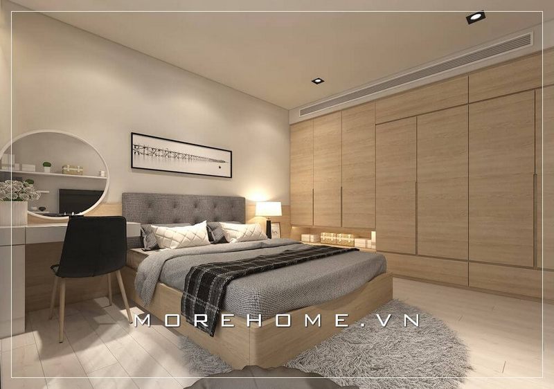Giường ngủ chung cư hiện đại, đơn giản, gam màu vàng gỗ công nghiệp đầy tinh tế tạo cảm giác thoải mái và ấm áp hơn cho mỗi giấc ngủ của gia chủ