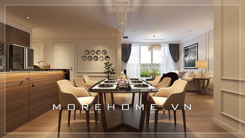 Phòng khách liên kết trực tiếp với khu vực ăn uống, tạo không gian mở và sự thông thoáng cho căn chung cư