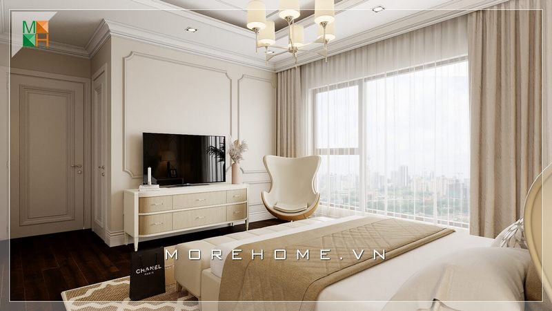 Phòng ngủ thiết kế nội thất với tông màu sáng nổi bật không gian như bừng sáng ấn tưởng tạo sự mới mẻ thoải mái cho chủ nhân.