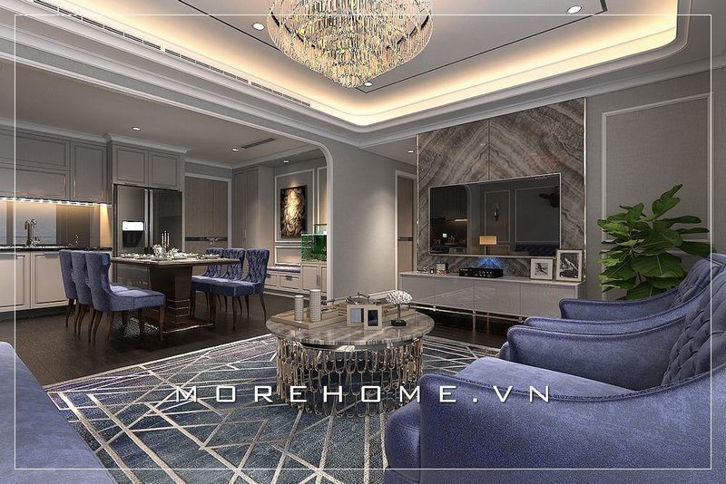 Mẫu thiết kế phòng ăn liền phòng khách phong cách tân cổ điển dành cho chung cư, biệt thự, với hệ thống đèn thả và trần giật cấp, giúp phân chia khu vực sinh hoạt rõ ràng mà tinh tế