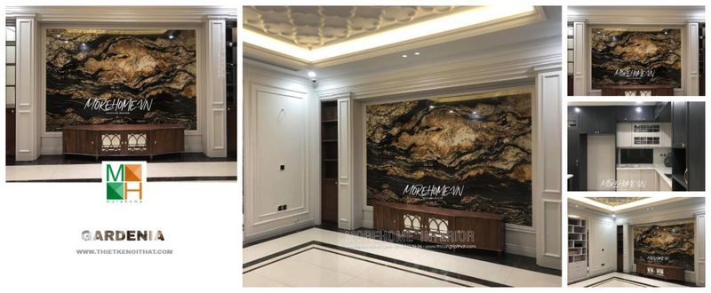 Đá ốp tường phòng khách với vân đối hoàn hảo tôn thêm nét nghệ thuật của không gian tân cổ điển, được Morestone thi công, hoàn thiện theo yêu cầu của từng gia chủ.