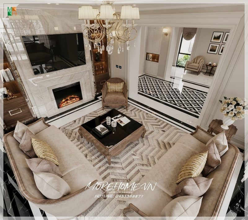Thi công nội thất phòng khách mang phong cách tân cổ điển sang trọng, quý phái không gian sống đẳng cáp cũng như thể hiện cá tính, sự giàu có của chủ nhà.