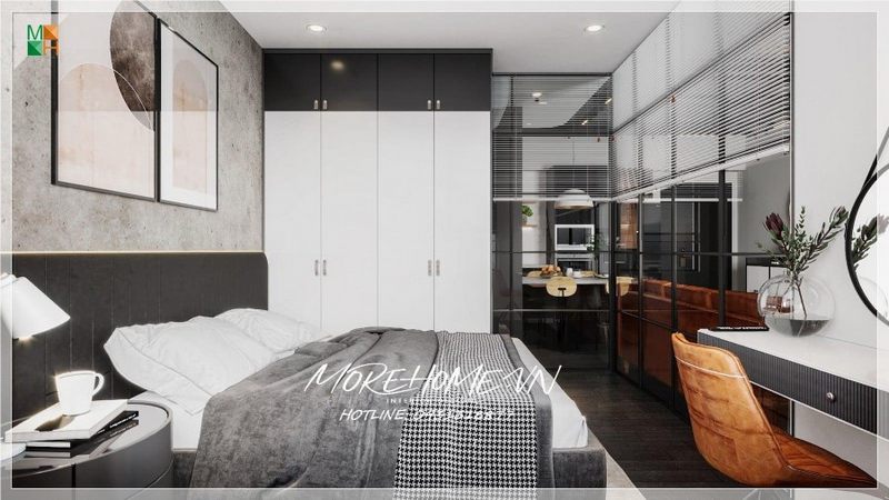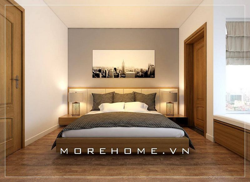 Phòng ngủ với thiết kế sàn gỗ công nghiệp với gam màu đồng điệu với nội thất giúp phòng ngủ thoáng rộng hơn