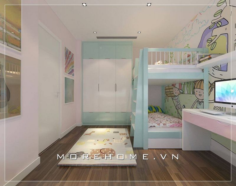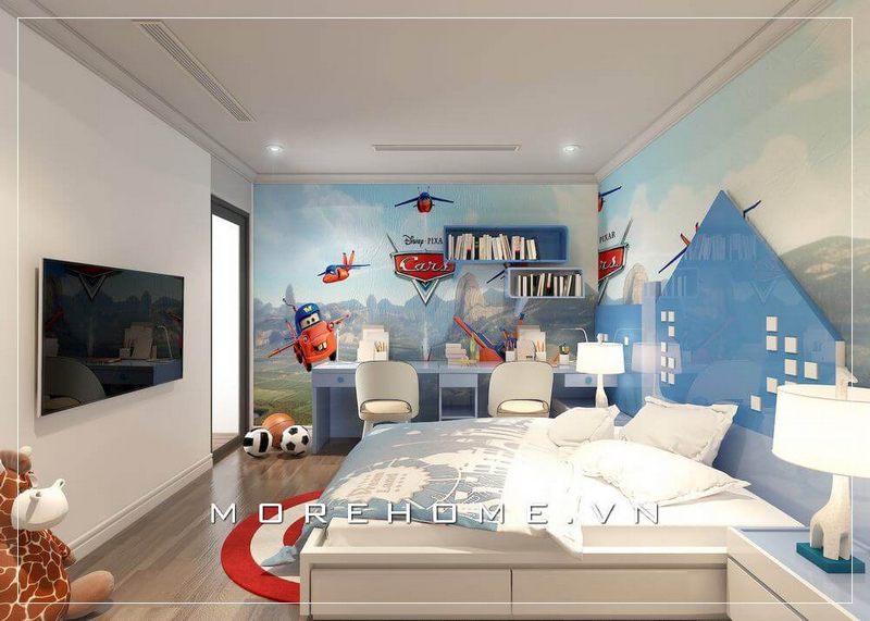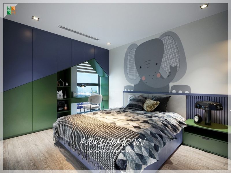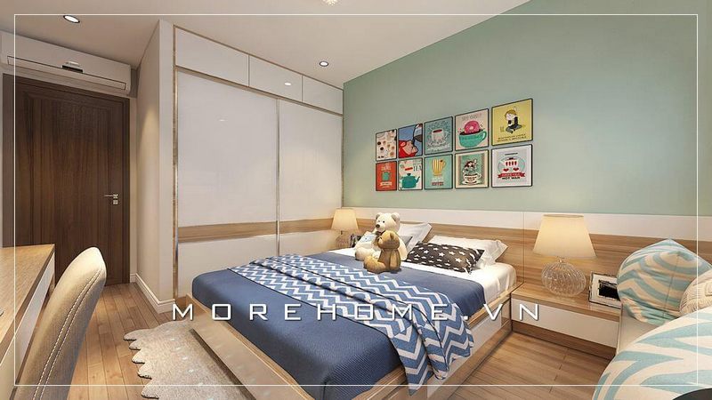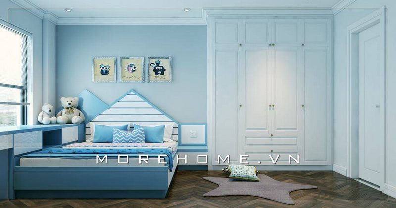 Trang trí nội thất phòng ngủ 2 bé trai hiện đại, gam màu xanh yêu thích của con được gia chủ lựa chọn cùng những họa tiết trang trí bắt mắt giúp con cảm thấy thích thú căn phòng của mình hơn