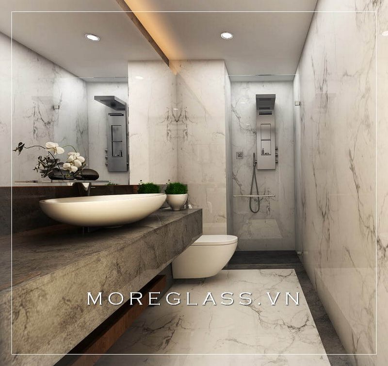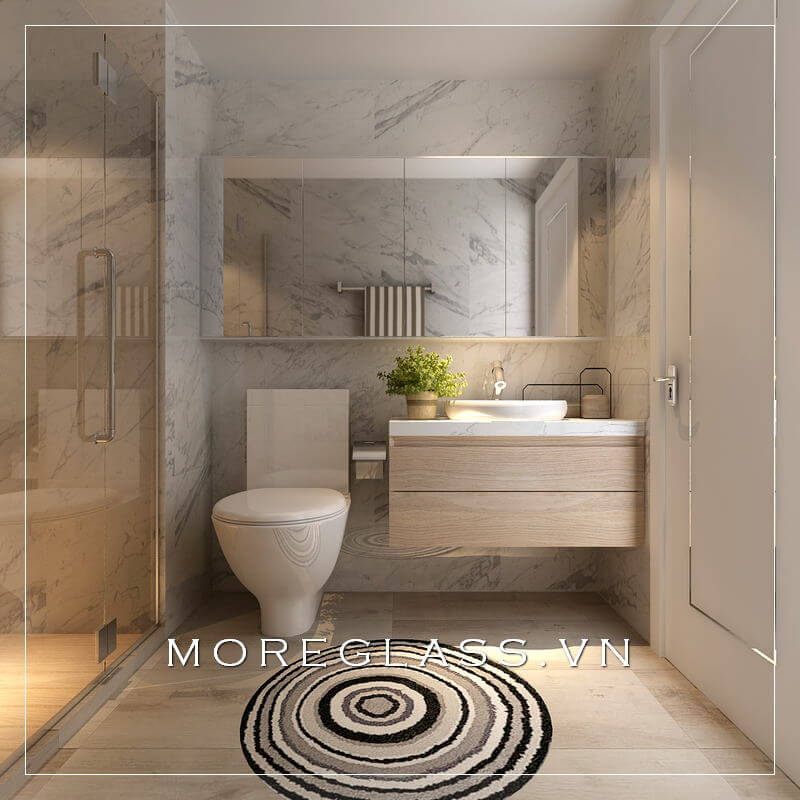 Vách tắm kính 180 độ ngăn giữ khu vực phòng tắm đứng và nhà vệ sinh tránh văng nước gây ướt át khó chịu mang cảm giác không thoải mái cho gia chủ.