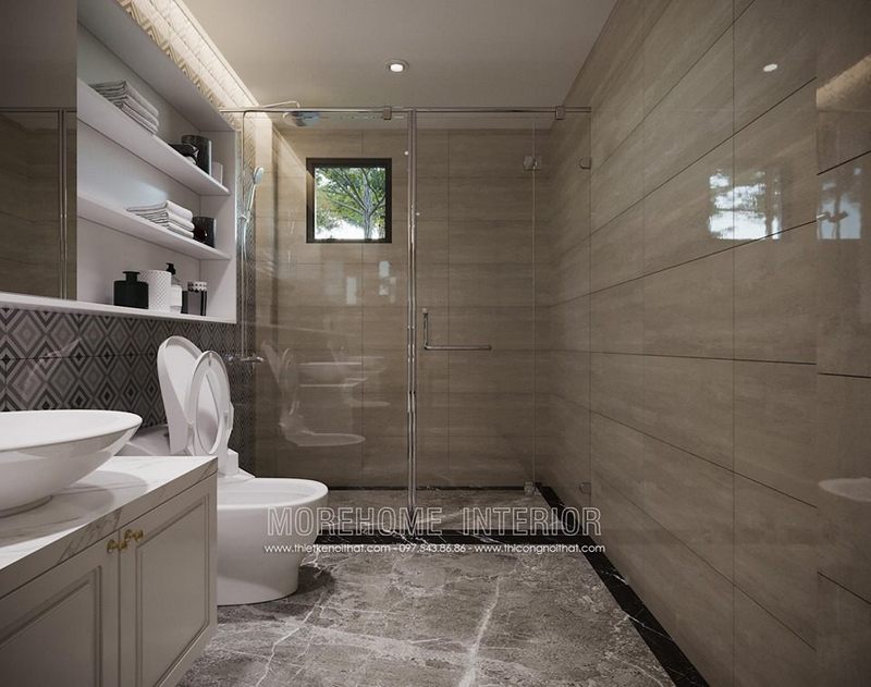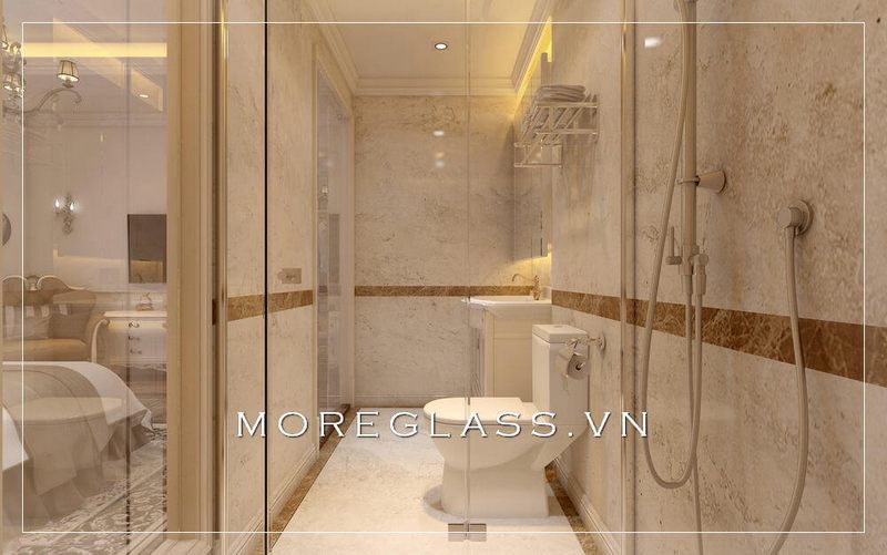 Vách tắm kính 180 độ giúp phân chia thành 2 khu vực riêng biệt giữa phòng tắm đứng và nhà vệ sinh, để tránh nước văng gây khó chịu khi sử dụng cho gia đình chủ.