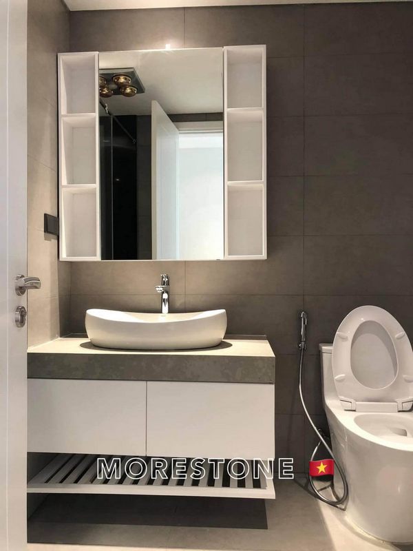 Trong phòng tắm, mẫu gương hiện đại hình chữ nhật được đặt giữa khung tủ tiện lợi làm nét đặc trưng của căn phòng.