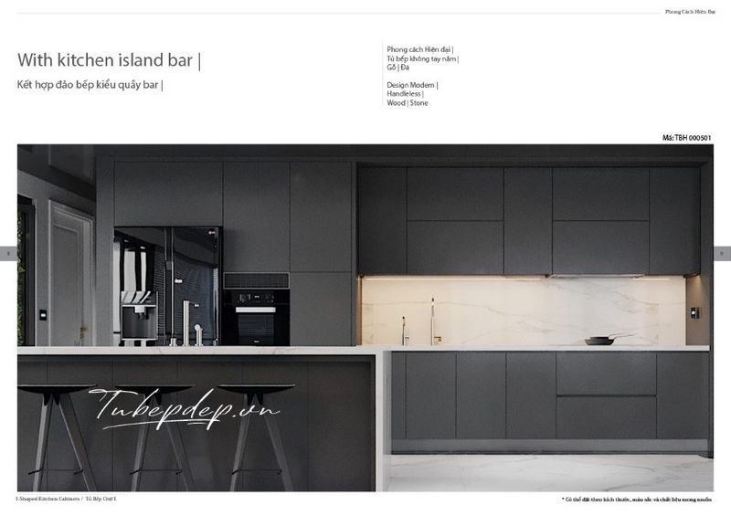 Đảo bếp mặt đá trắng bố trí thêm ghế làm quầy bar mang đến sự trẻ trung thời thượng cho không gian bếp màu xám hiện đại