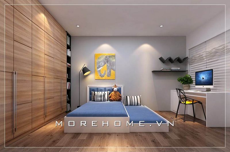 Nội thất phòng ngủ bé trai hiện đại và đẹp mắt, đặc trưng là một chiếc giường ngủ thông được làm từ chất liệu gỗ công nghiệp.