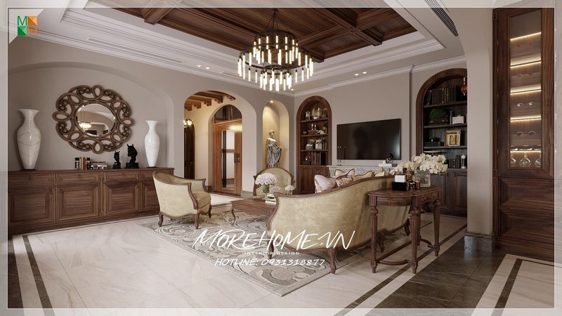 Phòng khách được thiết kế theo phong cách tân cổ điển không chỉ mang lại sự đẹp mắt mà còn tôn vinh vị thế của gia chủ.